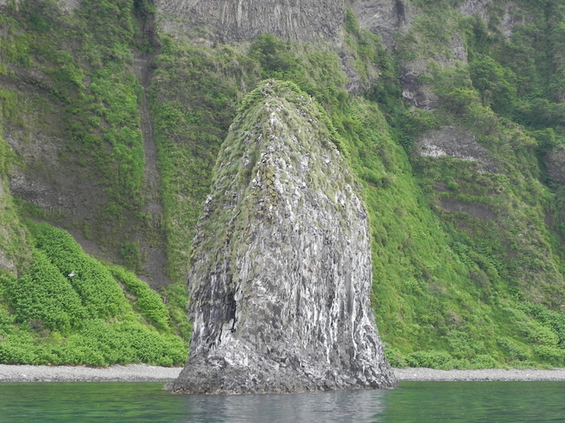 先日、道南のシタン島にあるコロニーを訪ねてきました。これほどの秘境にあるコロニーは国内にはまずないと思います。少なくとも道内にはありません。シタン島は矢越海岸(福島町)にある小さな島、というか岩ですが、ご覧のとおり人を容易に近づけない威容で周囲の景色の中でもひときわ目立っています。また、この島だけでなく、付近の海岸線一帯は軒並み切り立った崖になっており、船を利用してしか行けないようなところです。幸いなことにこの矢越海岸は知内町から小さな観光船が出ており、今回、シタン島へは海上からアプローチすることができました。利用したのは矢越クルーズさんの船で、1時間半、4,000円のクルーズです。私の場合はシタン島さえ確認できれば満足というものでしたが、矢越海岸は奇岩の林立するダイナミックな海岸美はもとより、途中、ミサゴの巣やウミウのコロニーも観察できますし、運が良ければシカやクマ、それにイルカの群れにも出会えるそうです。秘境の自然や野生動物に興味のある方にはまさに穴場の観光地だと思います。