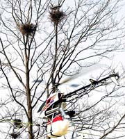 食害アオサギの繁殖抑制実験、無線ヘリで卵に洗剤噴霧