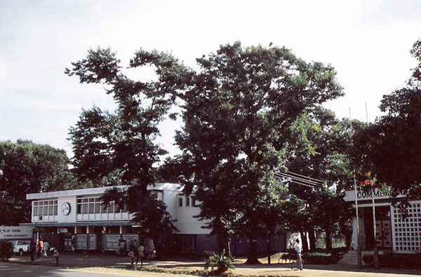巣の下が道路ということで、右の写真を添付してみました。これはアフリカのとある田舎町の中心部。左の建物がマーケット、右が銀行です。よく見ると木のてっぺんに鳥がとまっているのが分かりますが、これはズグロアオサギというアオサギの仲間で、じつはこの木がコロニーになっています。御覧のようにコロニーの真下を人が歩いています。これを見たときは、こんな場所にも営巣するのかと驚いたものですが、いまでは私の住んでいる北海道でもこれに近い環境でコロニーをつくっているケース(さすがにこれほど露骨ではありませんが)もありますし、人の往来の頻繁なところでの子育てというのは今や珍しいものではなくなってきたようです。
